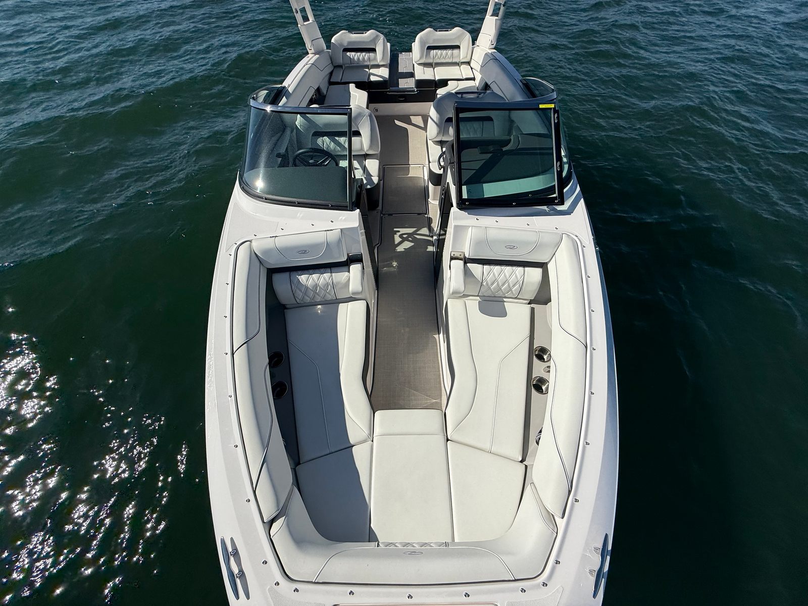 The striking Mediterranean Blue, Flame Red, and Tahiti White exterior is complemented by a Titanium interior, creating a bold and modern look. The spacious cockpit with wraparound seating makes entertaining easy, while the large swim platform and transom access keep water activities simple and fun. Regal’s thoughtful design and FasTrac hull combine comfort, style, and efficient handling, giving you a premium boating experience in a 26 plus foot platform.