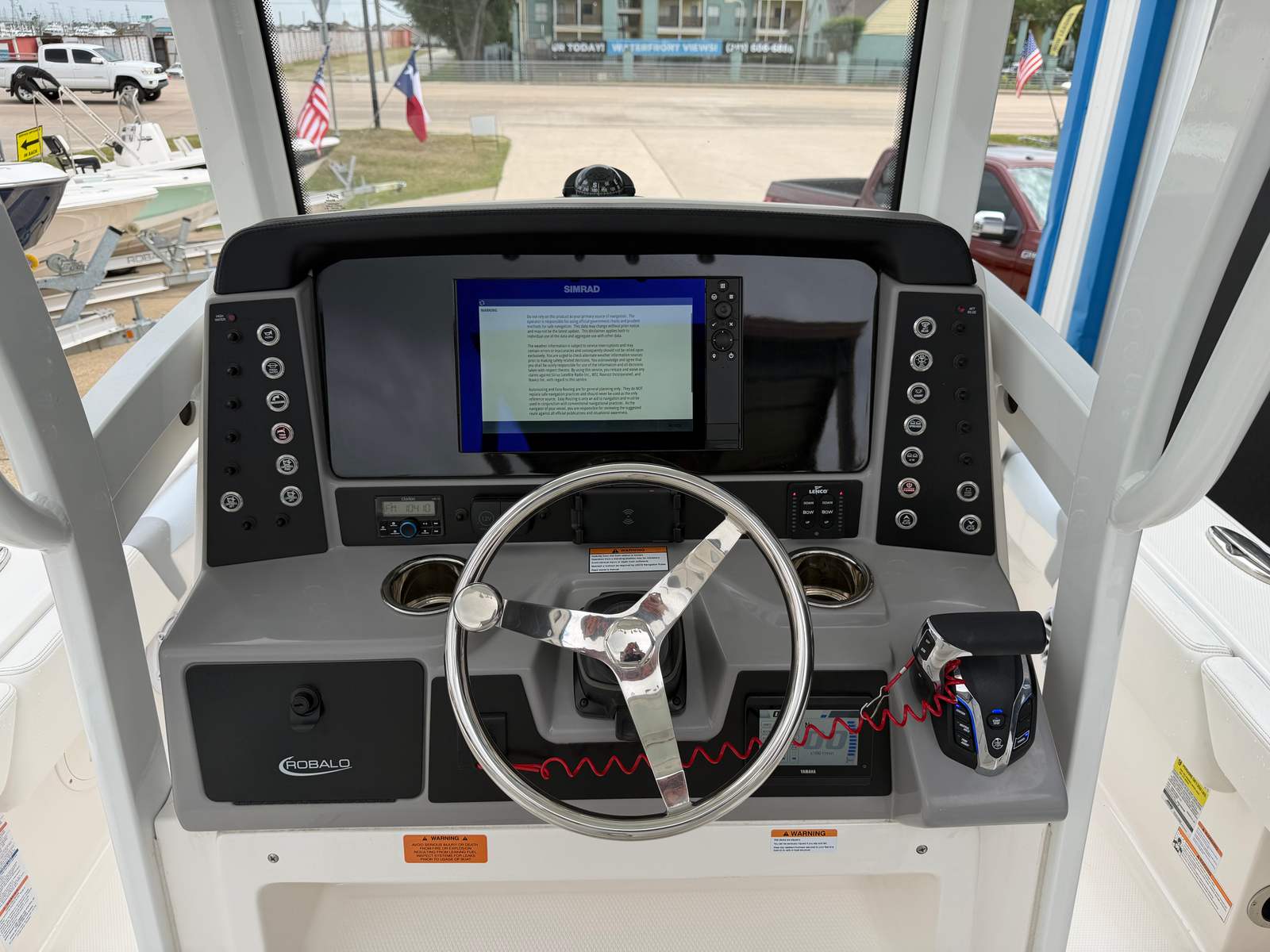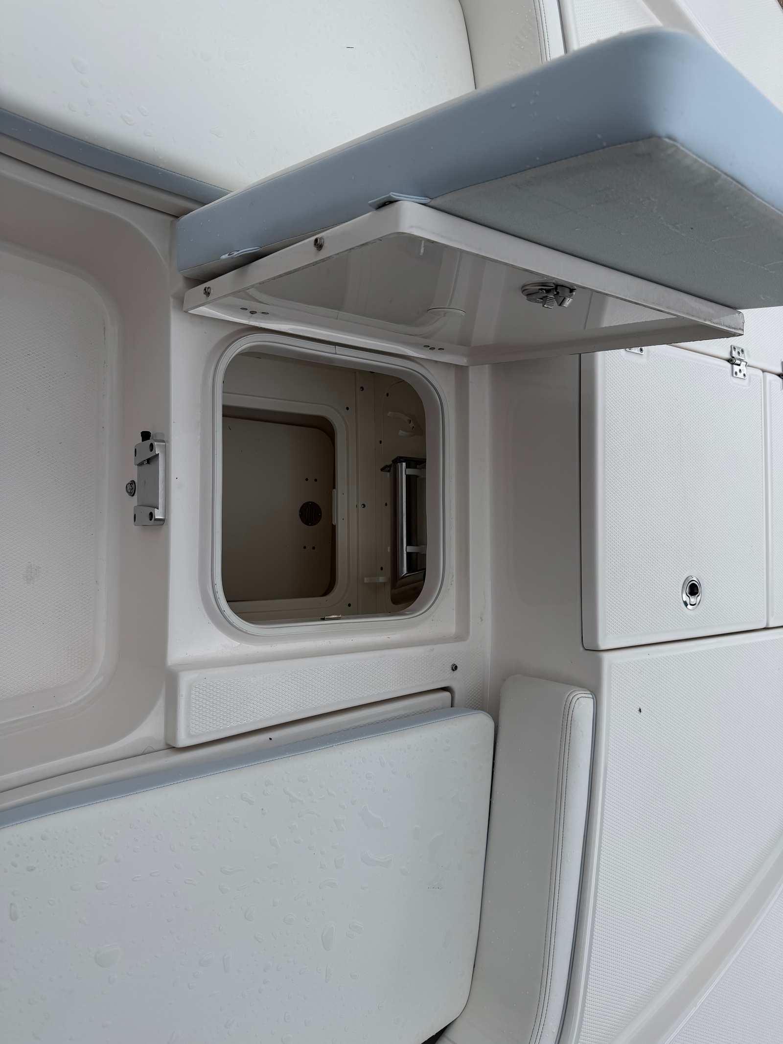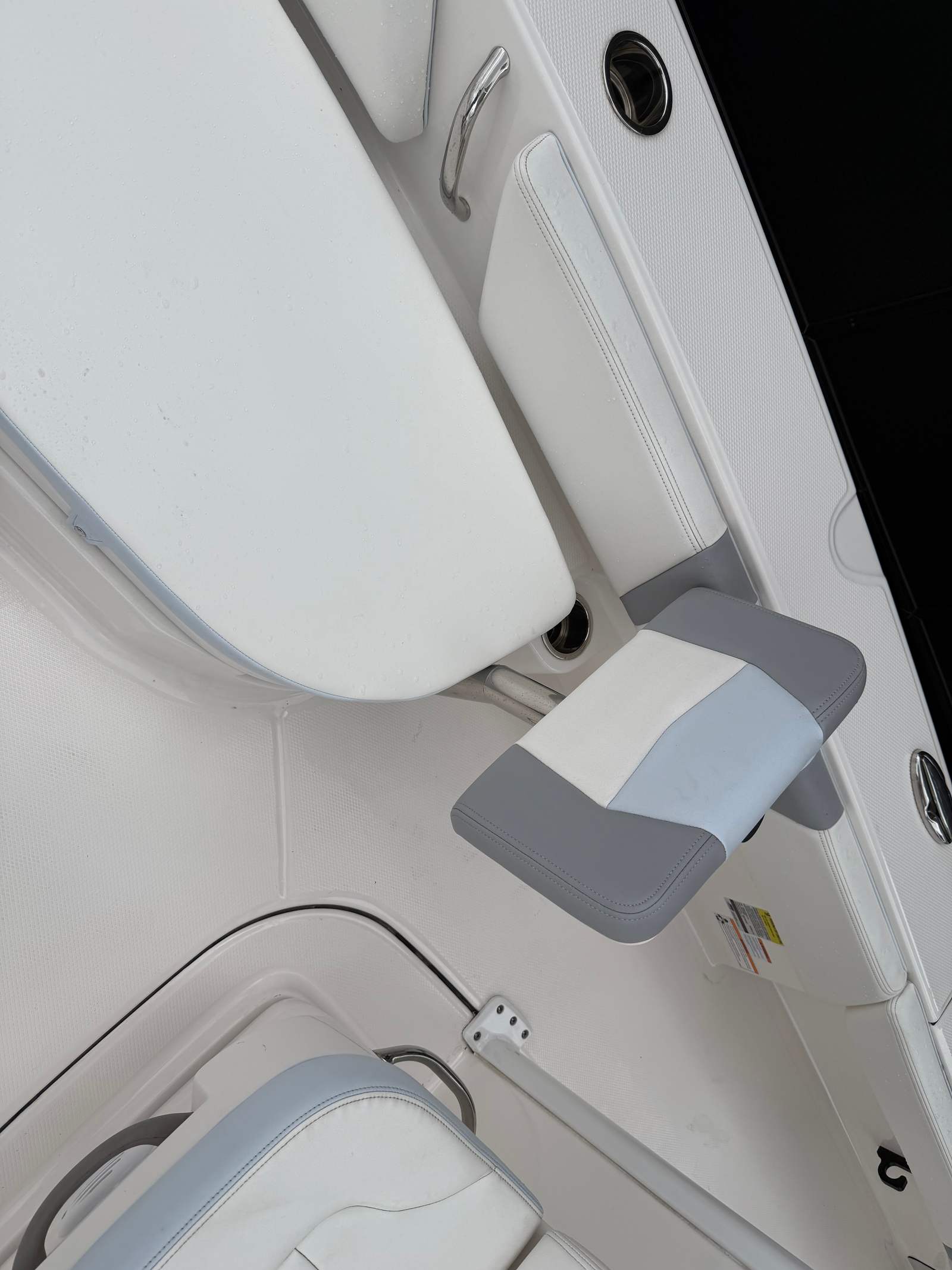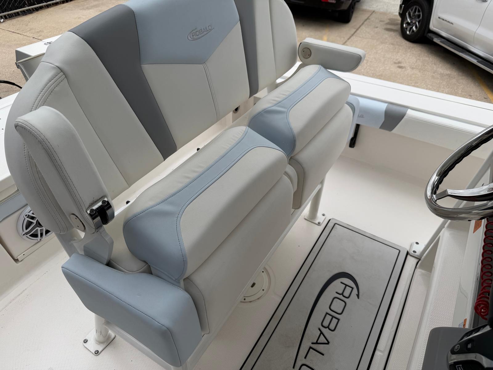 The Robalo 246 Cayman is packed with premium features that enhance both functionality and comfort. The solid hull gelcoat in Ice Blue not only adds a touch of elegance but also provides durability and protection against the elements. The cockpit interior, finished in Harbor Ice Blue, creates a cool and inviting atmosphere for all your guests.A standard hard top, powder coated in white, offers shade and protection from the sun, making long days on the water more enjoyable. The Simrad NSS12 EVO3S multifunction display puts navigation and fish-finding technology at your fingertips, ensuring you stay on course and in control. For those who appreciate high-quality sound, the JL Audio Sound System Upgrade delivers crystal-clear music, setting the perfect mood for any outing.Trim tabs with indicators allow for easy adjustment of the boat's attitude, improving stability and ride comfort in varying conditions. Dual color LED underwater lights (two on each side) add a dramatic flair for evening cruises and make nighttime activities safer and more enjoyable. The Seadek helm mat provides cushioned support for the captain, reducing fatigue during long days at the helm. For added convenience, a porta pottie is included, ensuring comfort during extended trips.