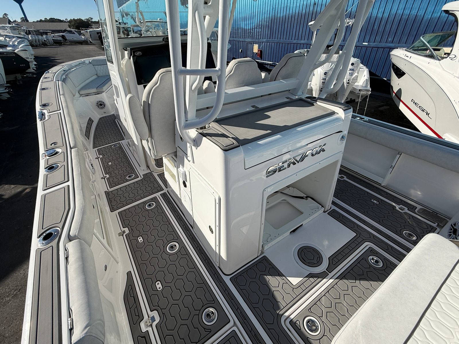 The Sea Fox 328 Commander is packed with features that cater to both serious anglers and those who simply love spending time on the water. Its center console design maximizes deck space, allowing for easy movement and unobstructed access to all areas of the boat. The 32-foot length provides a stable and comfortable platform, ideal for a variety of activities. The helm is thoughtfully designed for optimal visibility and control, ensuring that the captain has everything needed within easy reach. With its modern styling and attention to detail, this Sea Fox boat for sale is as visually appealing as it is functional.