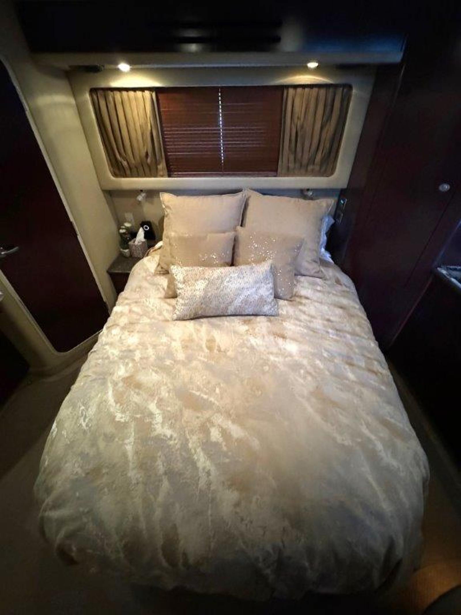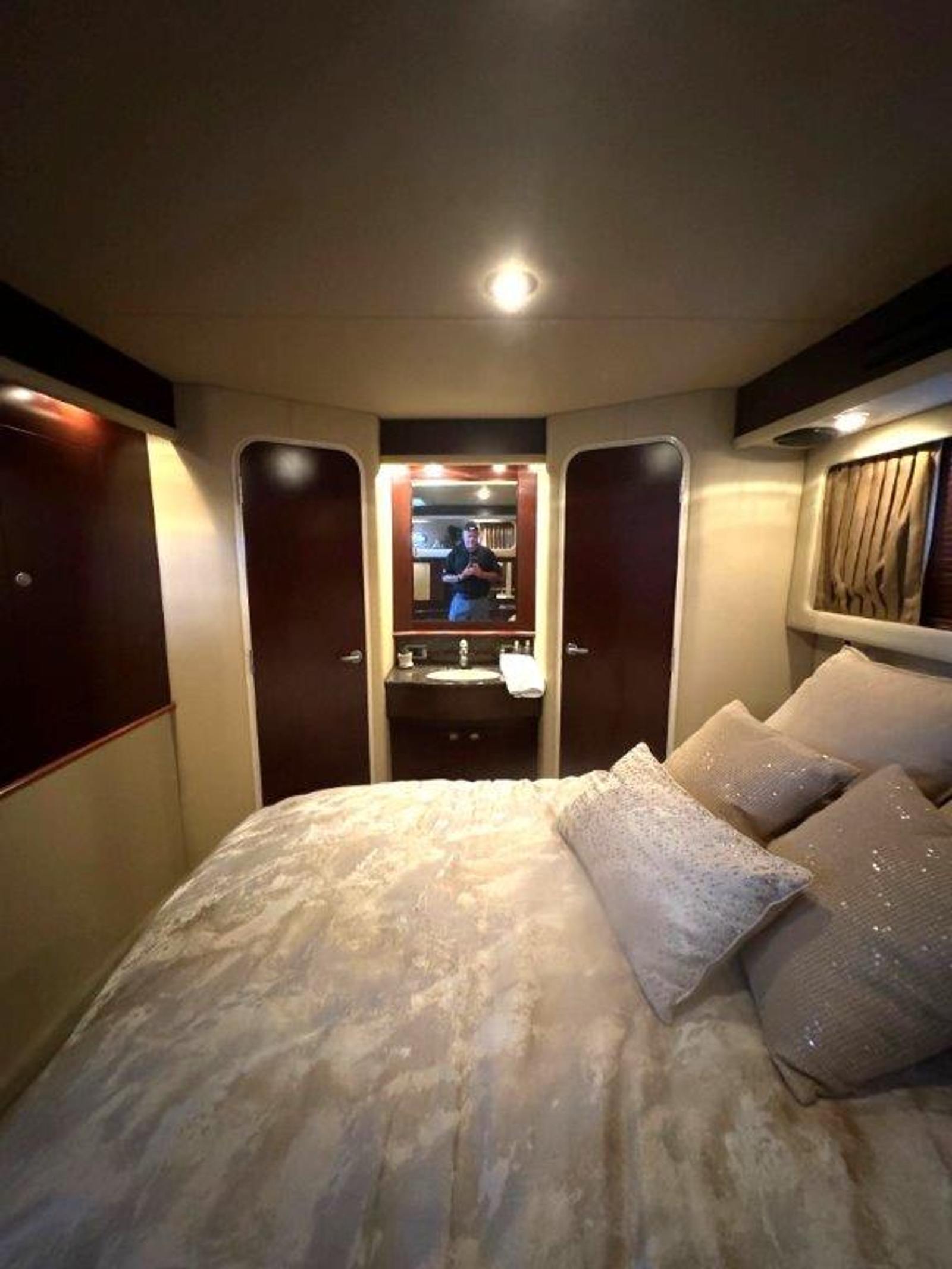 The salon is bright and open, perfect for entertaining, with a fully equipped galley that will please any onboard chef. Head up to the fully enclosed bridge, where A/C and heating let you cruise in comfort year-round — all while enjoying panoramic 360° views.