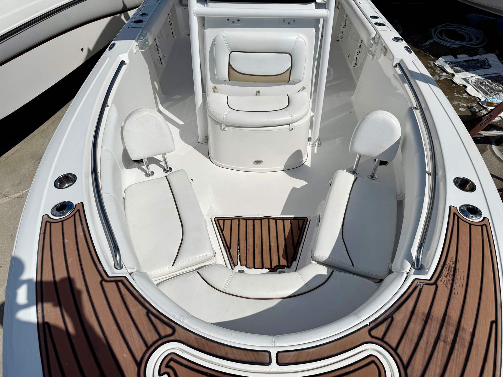 Comfort and entertainment are well covered thanks to the Infinity sound system with bow-to-stern speakers, delivering crisp audio throughout the boat whether you’re anchored at the sandbar or running offshore. An upgraded T-top provides ample shade and adds to the overall look and functionality of the vessel, making long days on the water more enjoyable.